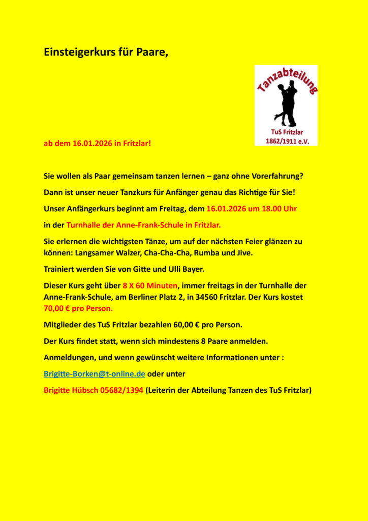 Die Tanzabteilung des TuS Fritzlar (Mitglied im hessischen Tanzsportverband) ist eine Breitensportgruppe für Jung und Alt in der nicht nur getanzt wird. In verschiedenen Gruppen werden von qualifizierten Trainern nicht nur Standard-und lateinamerikanische Tänze, sondern z. B. auch Disco-Fox, Mambo oder Boogie angeboten. Das Training ist moderat und es wird individuell auf den Einzelnen eingegangen. Tanzen ist ein idealer Ausgleich zum heutigen Alltag, bei dem auch soziale Kontakte geknüpft werden.